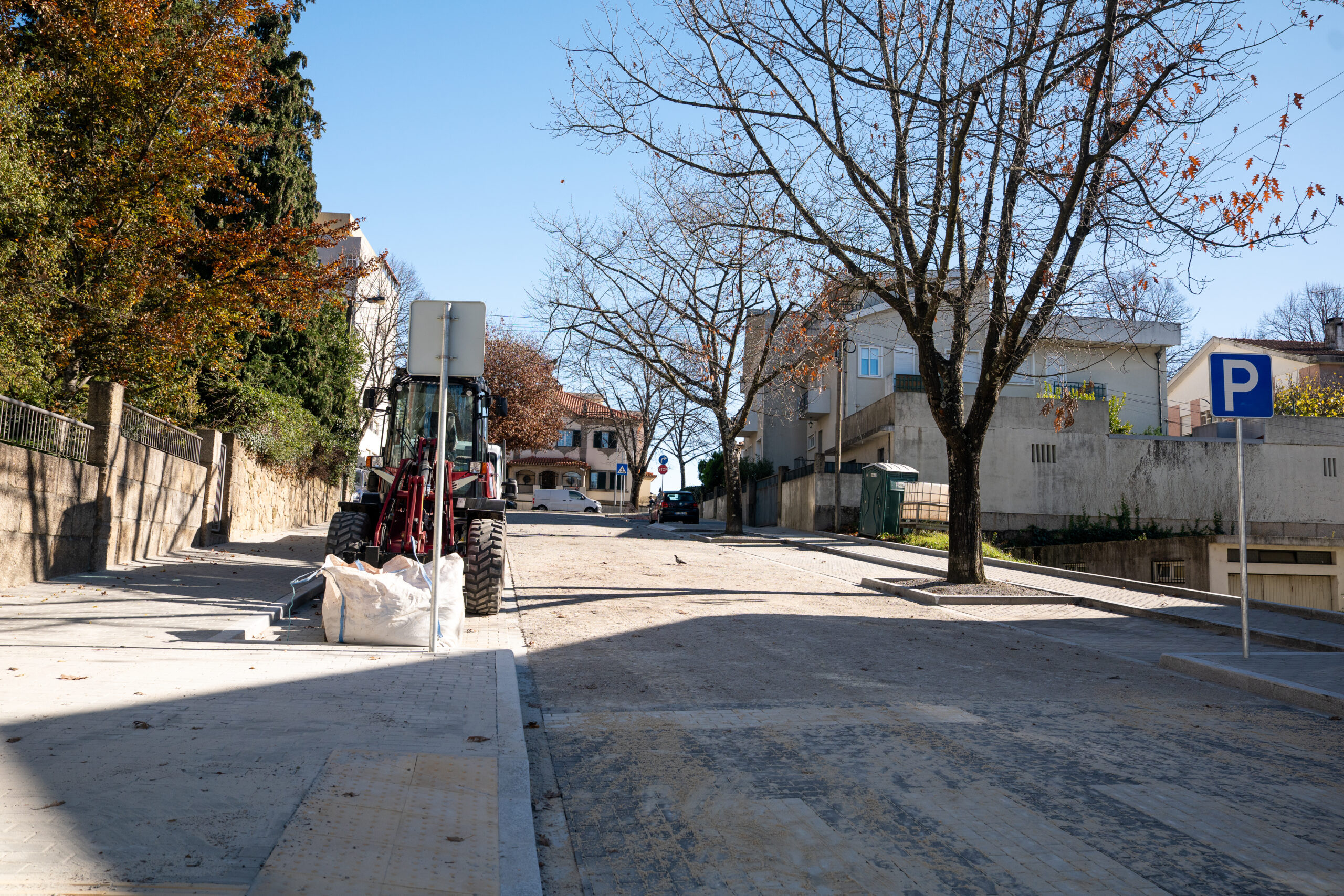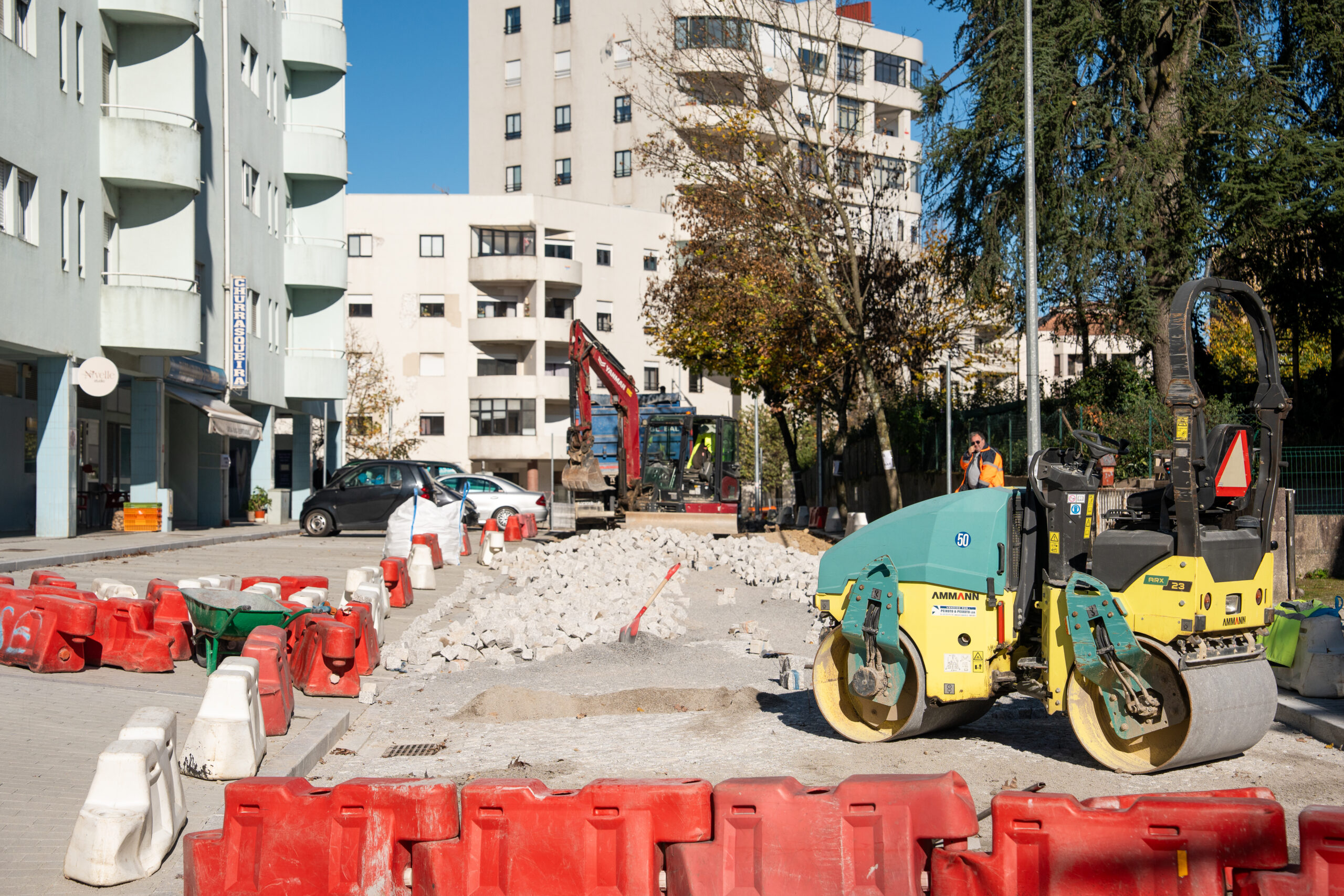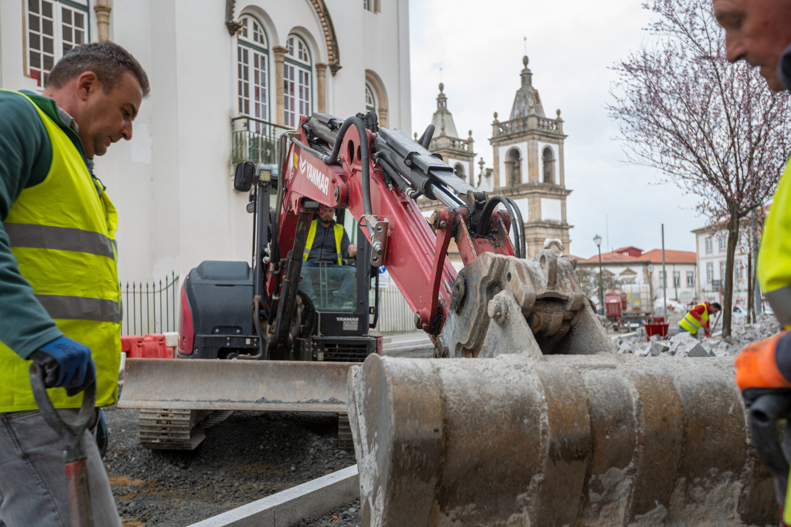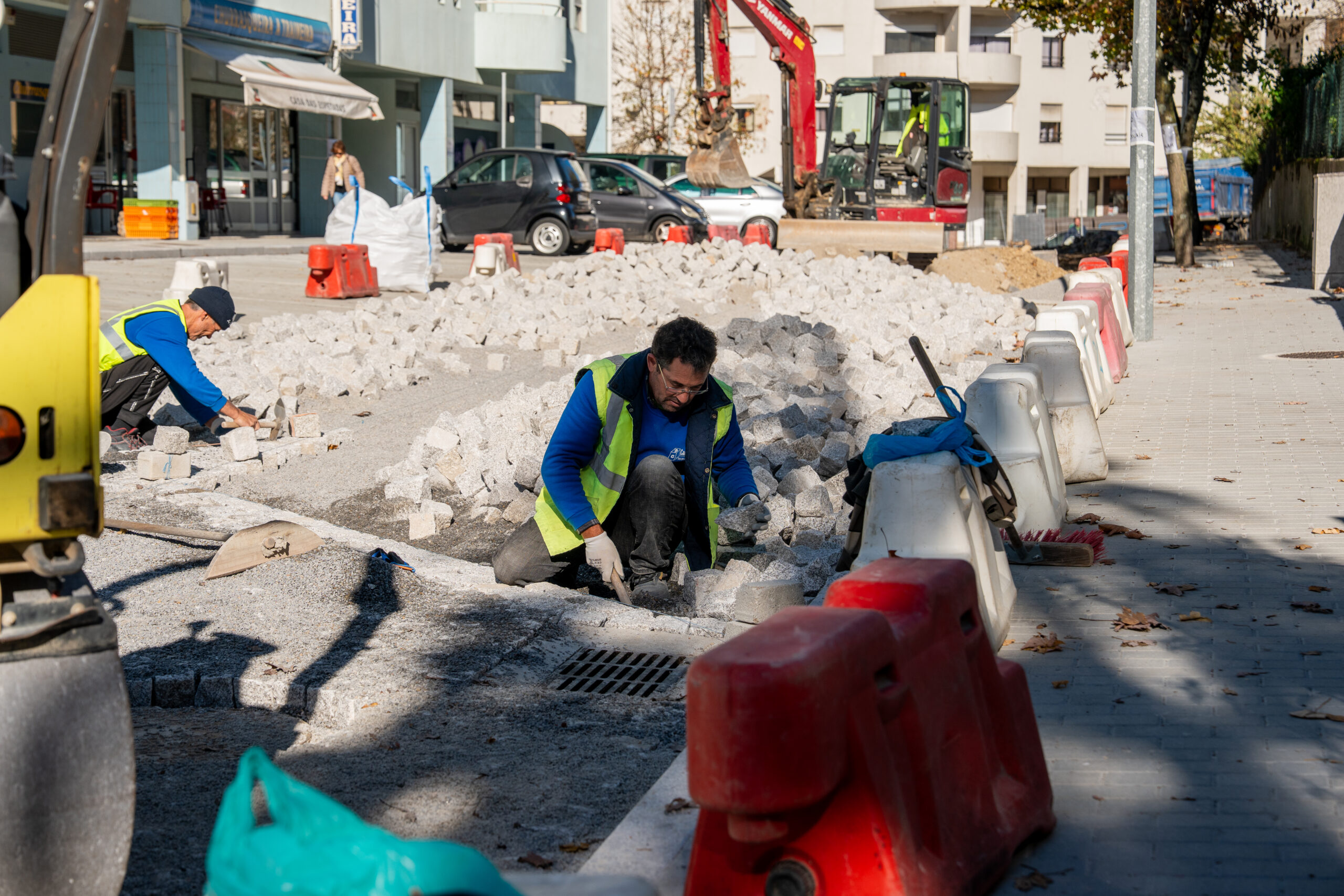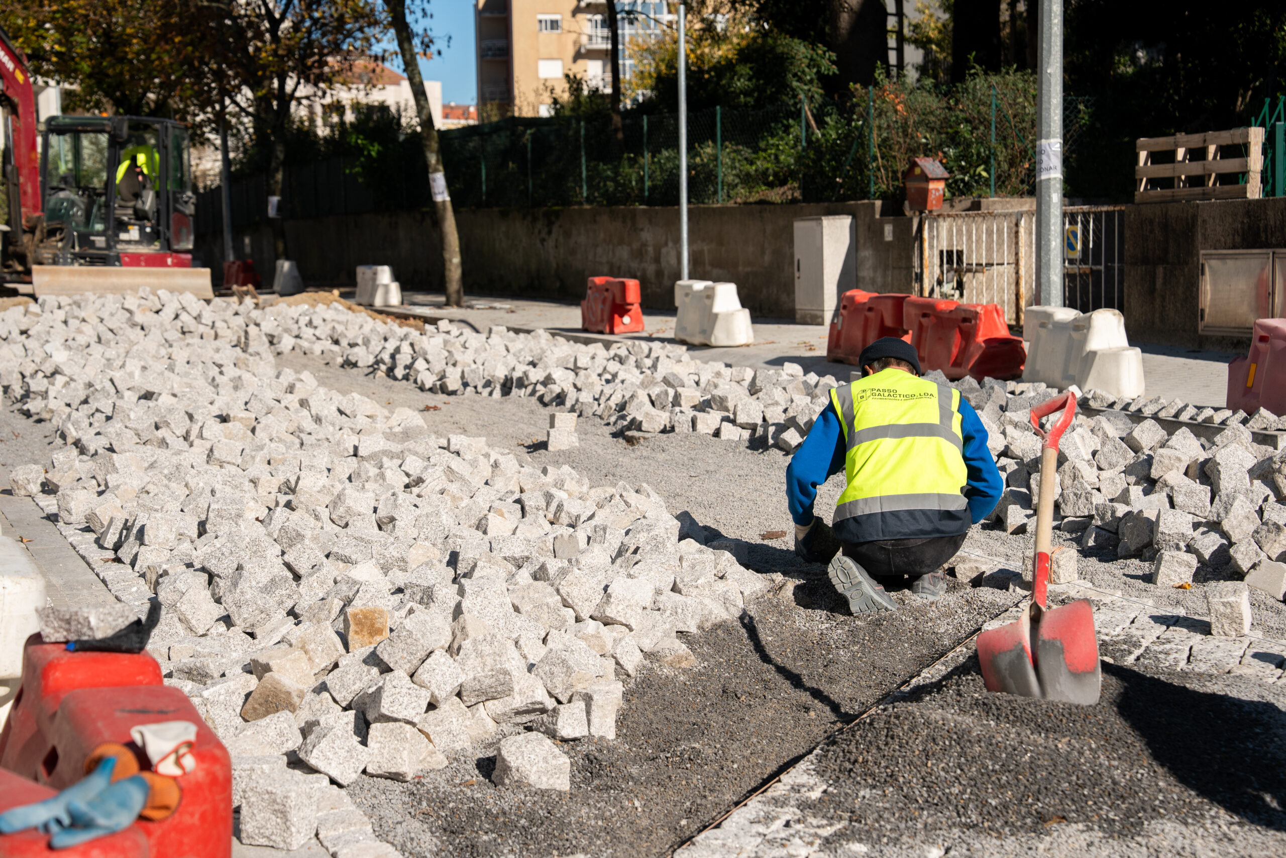 A intervenção incidiu na pavimentação, em que elevamos o padrão das infraestruturas urbanas com pedra natural, unindo estética, segurança e durabilidade.